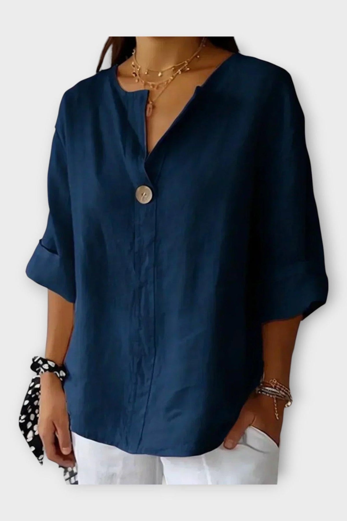 Marie | Camisa de cuello en V es un símbolo de la elegancia nórdica atemporal. Confeccionada en ligero tejido de lino, esta camisa combina un corte relajado con un cuello en V y un botón discreto en el escote, reflejando la calidad artesanal de la marca.