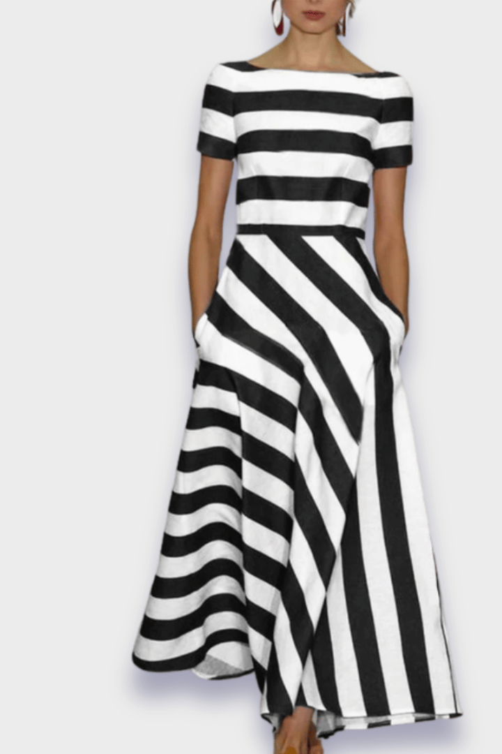 Louise | Hecho a mano a rayas es el vestido perfecto para quienes buscan sofisticación y comodidad. Diseñado para mujeres que desean destacar sin sacrificar la ergonomía, este vestido se drapea de manera suave y natural gracias a su material ligero y transpirable.