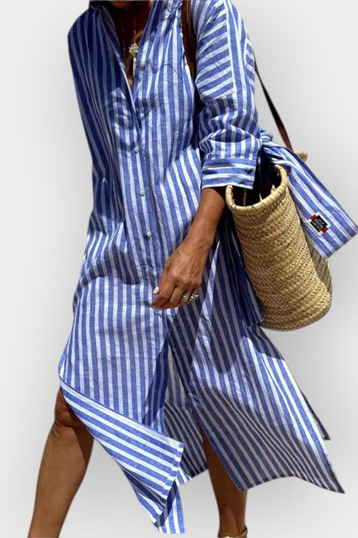 Luna | Vestido de camisa a rayas combina la elegancia clásica con la ligereza contemporánea. Cada detalle refleja la artesanía y un legado de diseño atemporal, mientras que su patrón a rayas en una paleta neutral garantiza un estilo exclusivo que perdura año tras año.
